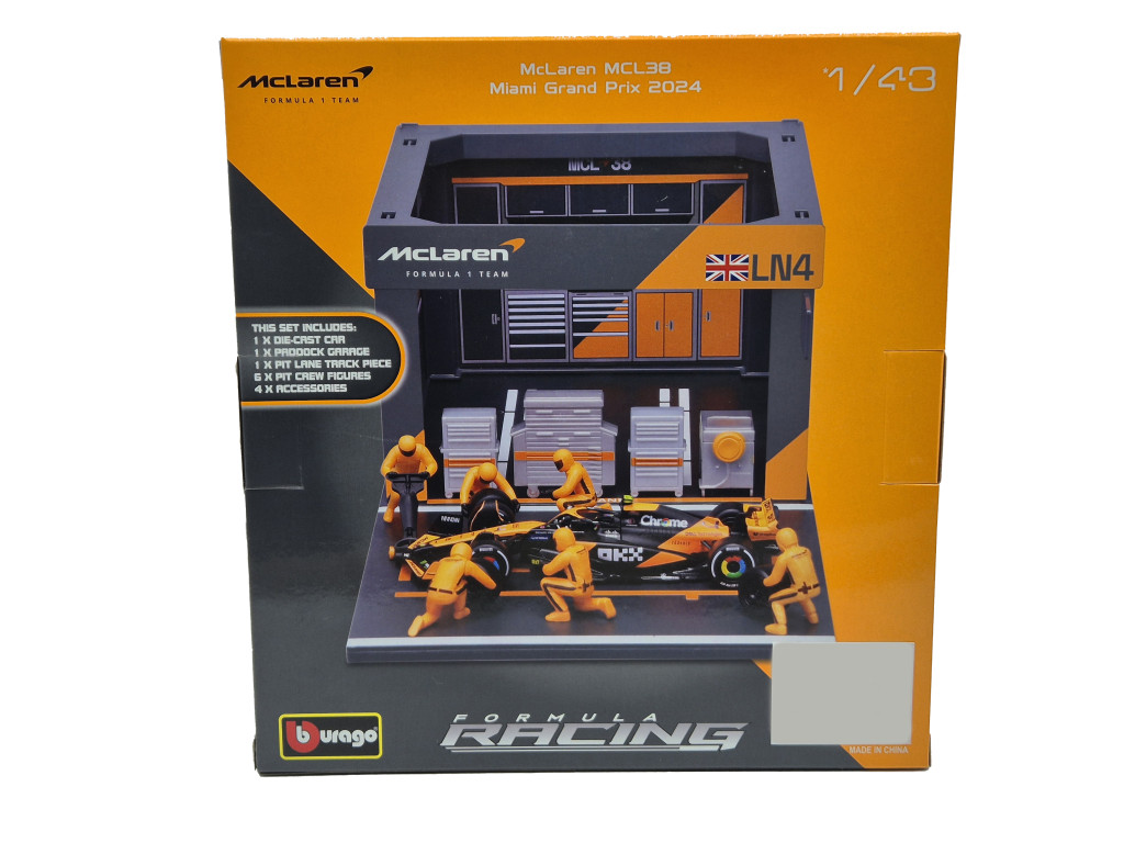McLaren Pit Stop - dioramă box - MCL38 F1 #4 (2024) - Lando Norris - cu mecanici - Bburago - 1:43