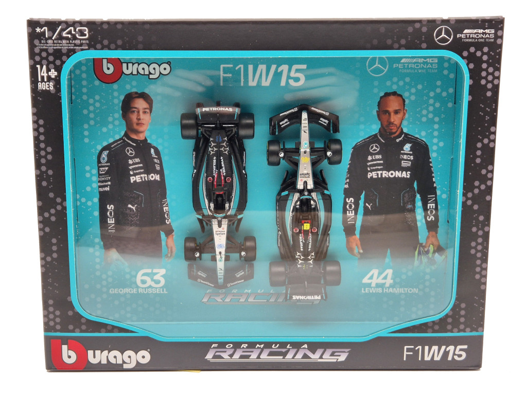 Setul Bburago 18-38115-PACK2 Mercedes W15 F1 este o colecție premium la scara 1:43, formată din două modele detaliate care reproduc monoposturile folosite de echipa Mercedes-AMG Petronas în sezonul 2024. Pachetul include mașinile pilotate de #44 Lewis Hamilton și #63 George Russell, oferind o reprezentare fidelă a designului modern și a elementelor aerodinamice ale modelului W15. Caroseria, vopseaua, sponsorii și detaliile fine sunt realizate cu precizie, transformând setul într-o piesă de colecție de înaltă calitate.
