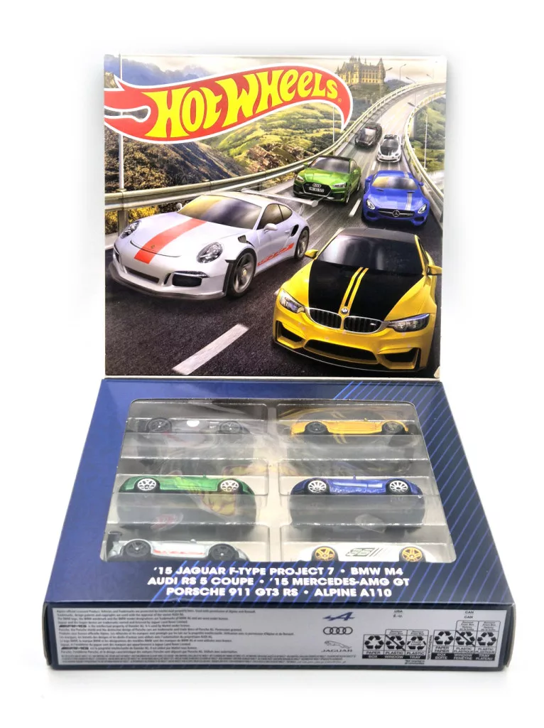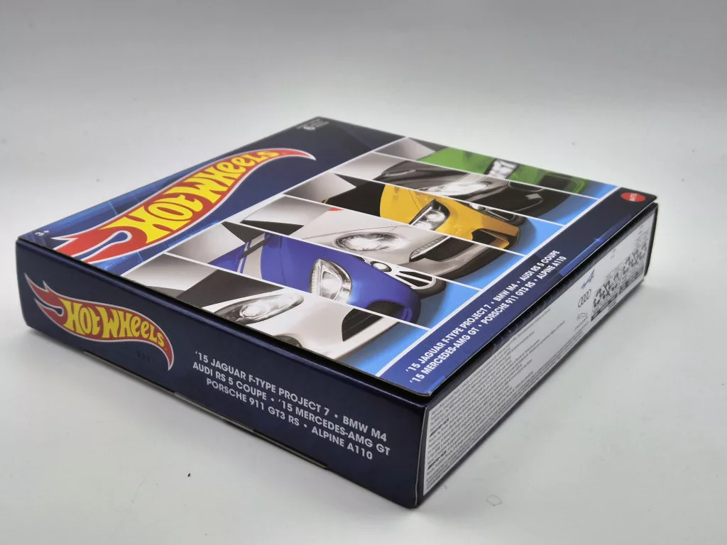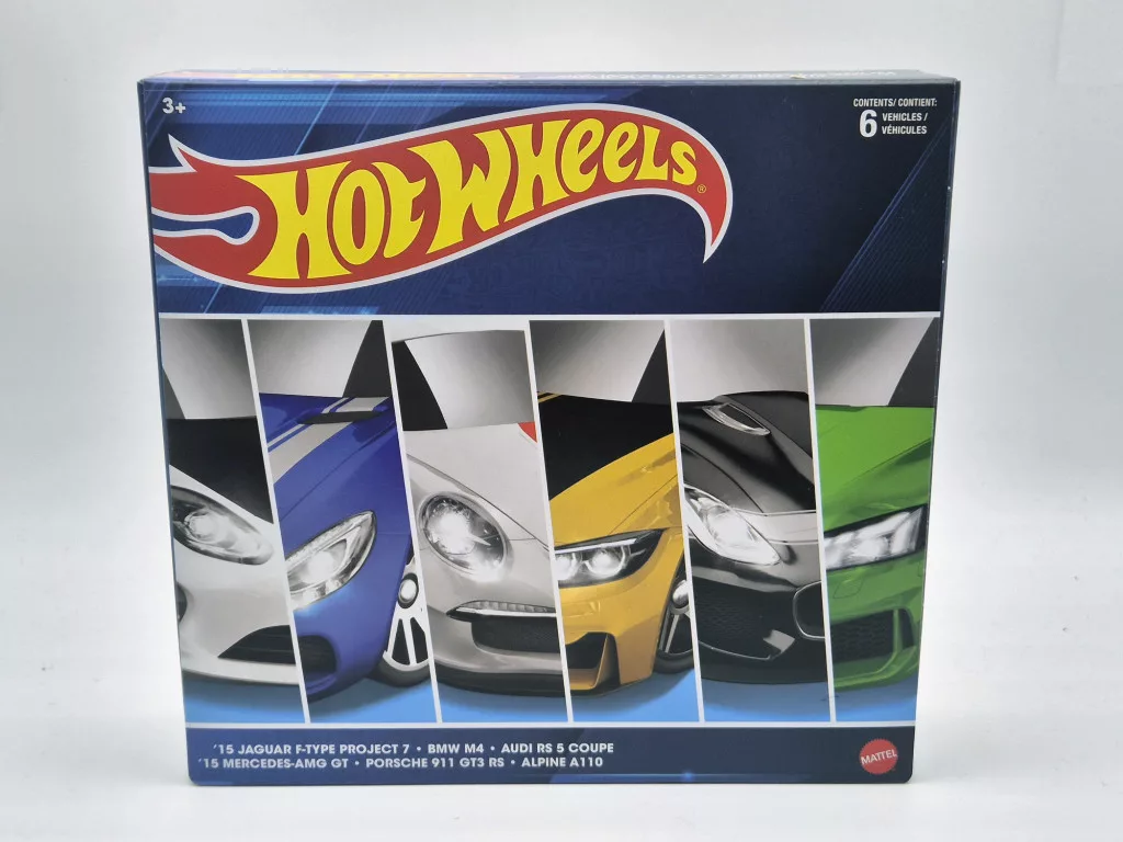 Set Hot Wheels 6 bucăți - Jaguar F-Type Project 7 / BMW M4 / Audi RS 5 Coupe / Mercedes AMG GT / Porsche 911 GT3 RS / Alpine A110 - Hotwheels - 1:64 1/64 mașinuță (m00822)