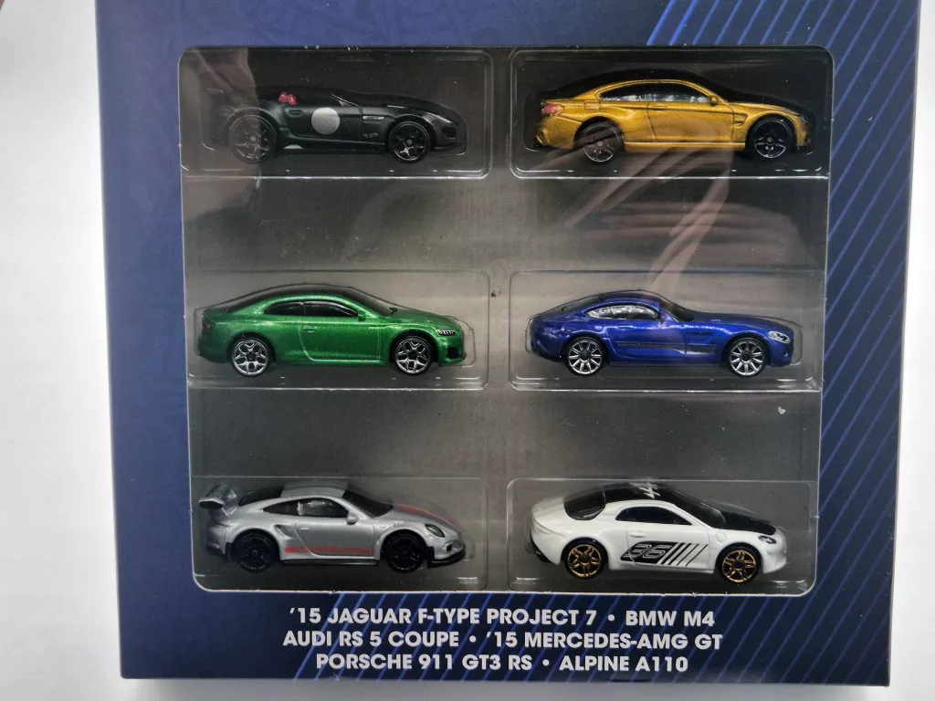 Set de 6 mașini Hot Wheels - Jaguar F-Type Project 7 / BMW M4 / Audi RS 5 Coupe / Mercedes AMG GT / Porsche 911 GT3 RS / Alpine A110 - Hotwheels - 1:64