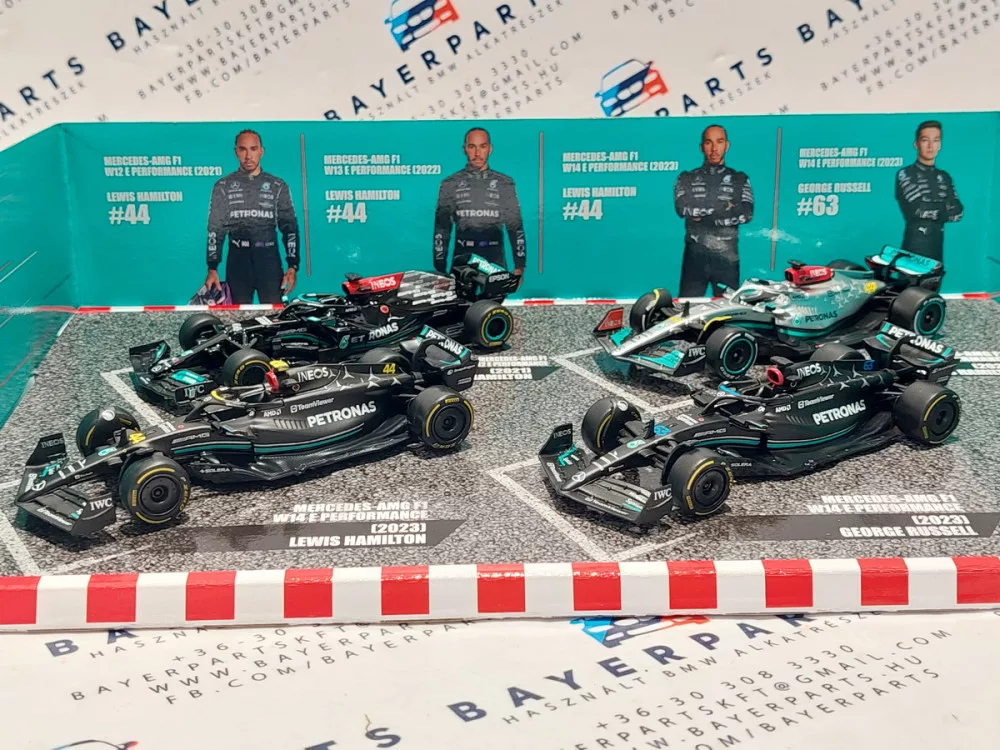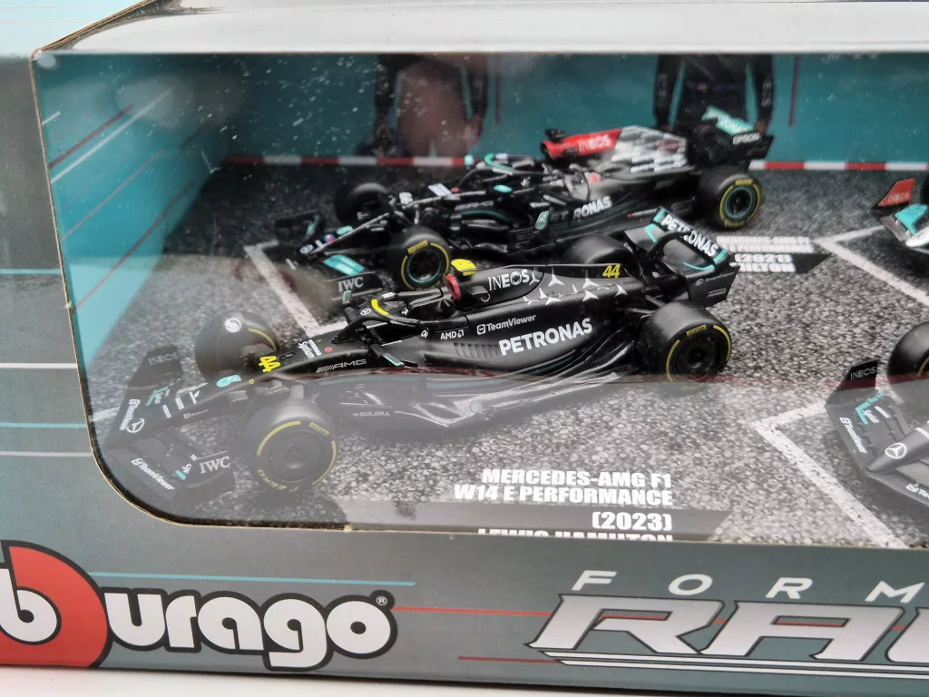 Set Mercedes GP F1 - 2023 W14 Lewis Hamilton - 2023 W14 George Russell - 2022 W13 Lewis Hamilton - 2021 W12 Lewis Hamilton - Bburago - 1:43