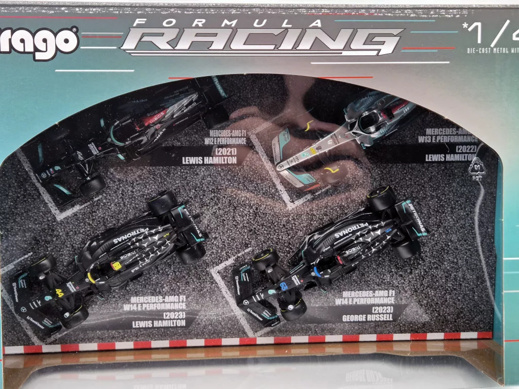 Set Mercedes GP F1 - 2023 W14 Lewis Hamilton - 2023 W14 George Russell - 2022 W13 Lewis Hamilton - 2021 W12 Lewis Hamilton - Bburago -1:43 (m01934)
