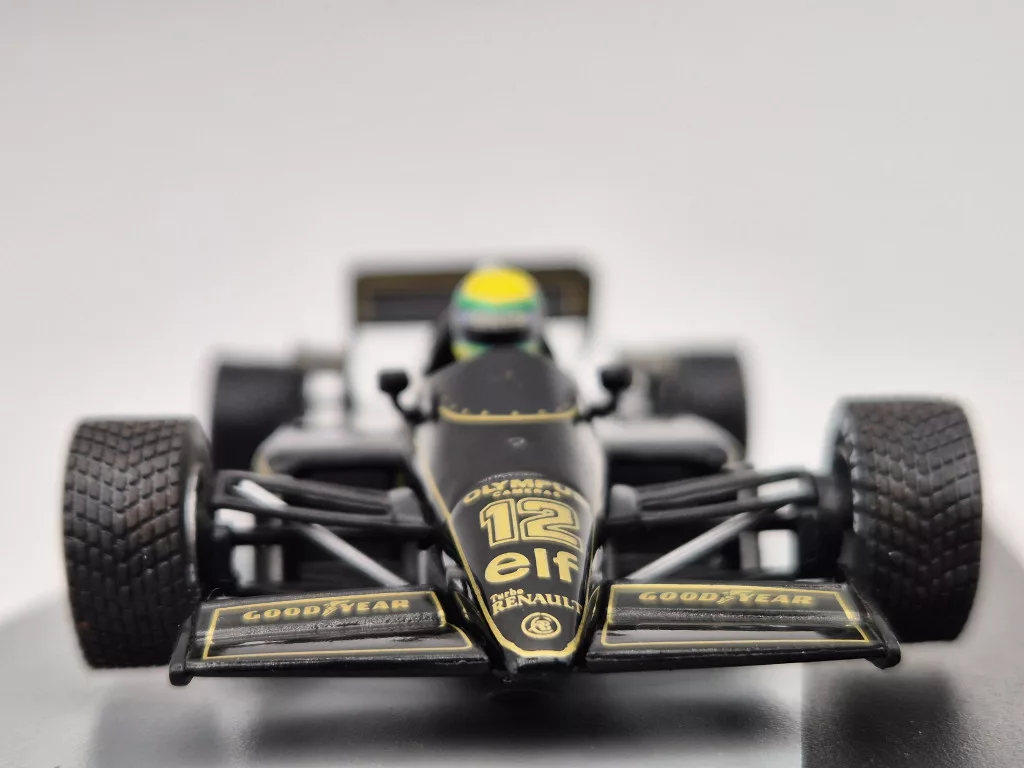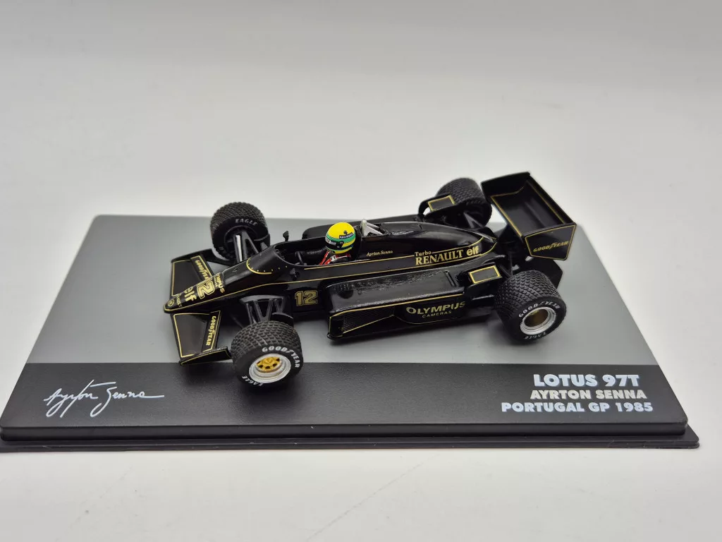 Lotus 97T F1 #12 (1985) - GP-ul Portugaliei - Ayrton Senna - CU PILOT - Edicola - 1:43 1/43 model mașină - cu vitrină crăpată (m02855)