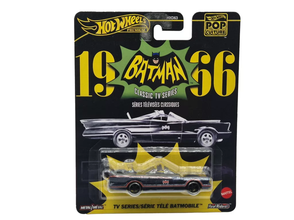 Hot Wheels Premium Pop Culture – Batman TV Series Batmobile prezintă celebrul vehicul într-o execuție premium. Legendara Batmobilă din serialul Batman al anilor ’60 primește caroserie metalică, roți Real Riders din cauciuc și decor detaliat. O piesă esențială pentru orice colecție dedicată fanilor Batman, DC sau culturii pop.