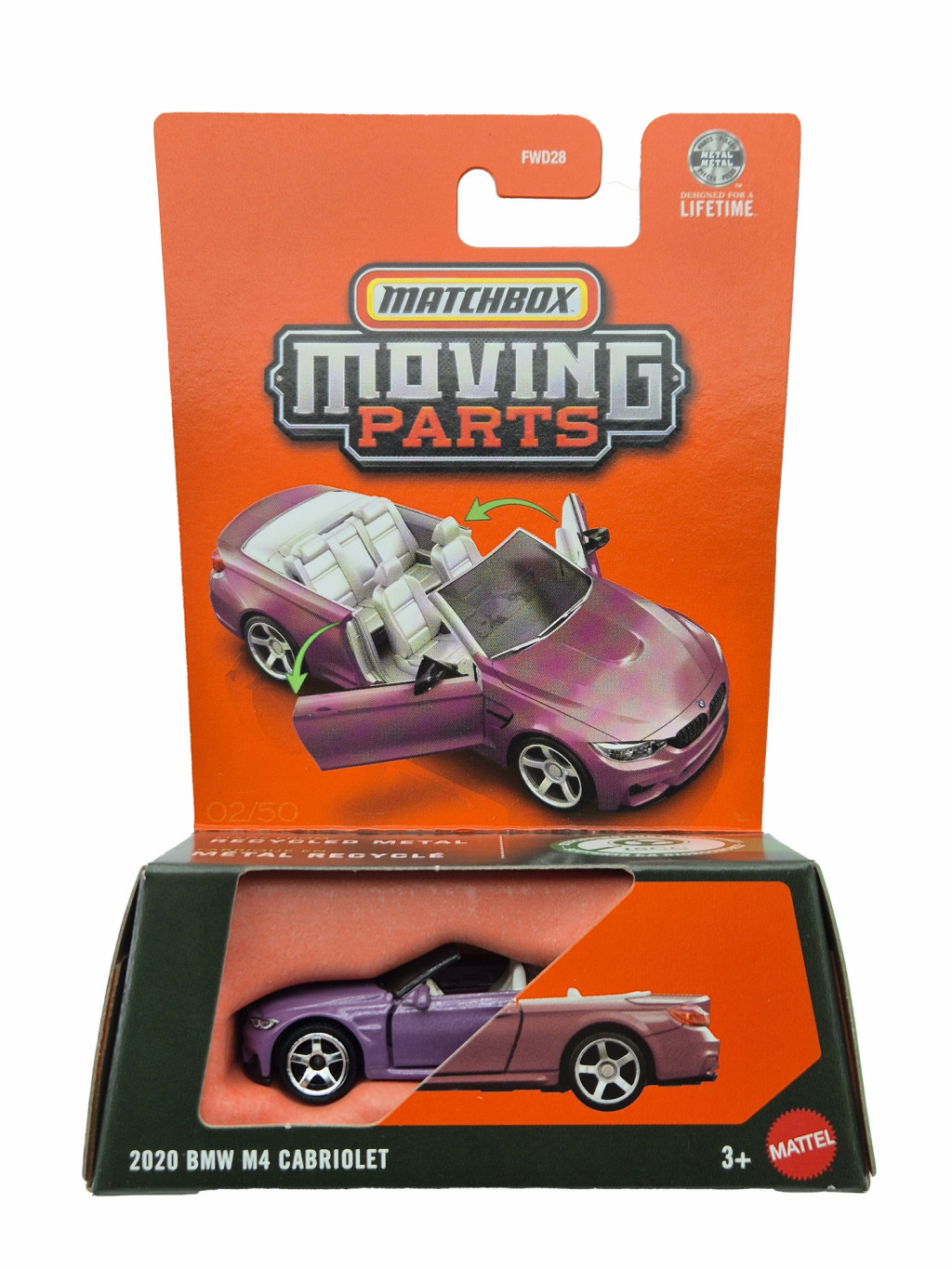 Modelul Matchbox Moving Parts – BMW M4 Cabriolet (2020) aduce la scară 1:64 unul dintre cele mai moderne și impresionante modele BMW M. BMW M4 Cabriolet îmbină puterea brută și dinamica sportivă cu luxul și libertatea unui automobil decapotabil. Designul său agresiv, dar elegant, lățimea impunătoare și liniile ferme transmit imediat ideea de performanță pură.