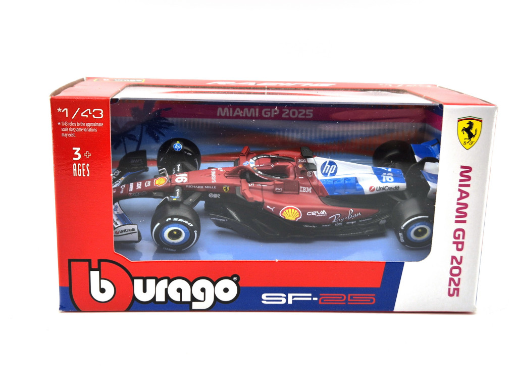 Modelul Ferrari SF-25 Team Scuderia F1 #16 (2025) – Miami GP – Charles Leclerc la scara 1:43, realizat de Bburago, aduce în colecția ta unul dintre cele mai moderne monoposturi Ferrari din Formula 1. Culorile emblematice Scuderia Ferrari și atmosfera specifică Marelui Premiu de la Miami sunt reproduse fidel într-un model diecast dedicat fanilor motorsportului.