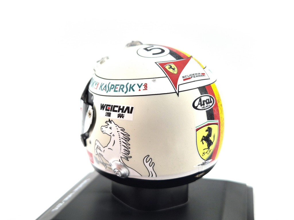 Casca de Formula 1 purtată de Sebastian Vettel în sezonul 2015 marchează primul său an la echipa Ferrari, amintind de debutul unei noi etape în cariera campionului mondial german. Designul cu bază albă, bogat în detalii, este completat de culorile roșii iconice Ferrari și motive personale, oferind un aspect modern și dinamic. În sezonul 2015, Vettel a obținut mai multe victorii de cursă, aducând un nou impuls echipei din Maranello în Campionatul Mondial de Formula 1. Scara 1:5 oferă o execuție precisă și proporții echilibrate, fiind ideală pentru expunere în vitrină. Imprimeurile clare și detaliile autentice fac din acest model o piesă spectaculoasă pentru orice colecție F1 sau Ferrari.